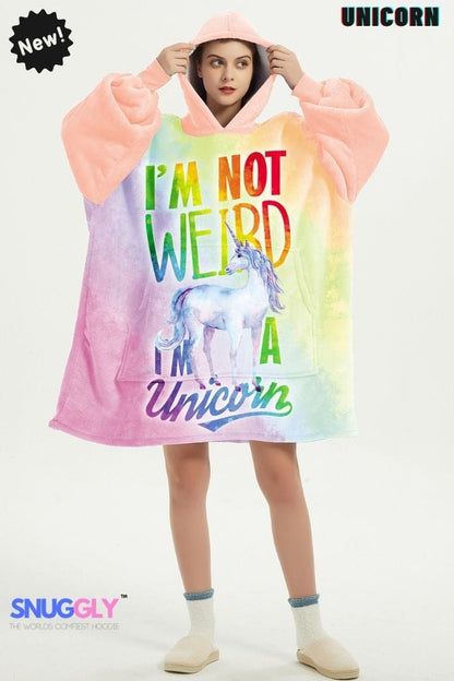 Our blanket hoodie features a whimsical unicorn design and the playful message "I'm Not Weird, I'm a Unicorn," celebrating individuality and imagination. It's an ideal gift for unicorn lovers, free spirits, or anyone who dances to their own beat.
